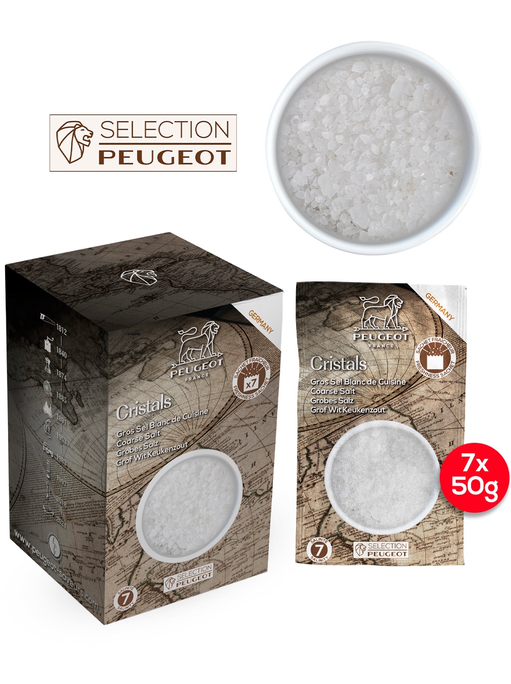 Peugeot grof wit tafelzout 350 g - 7 vershoudzakjes van 50 g.